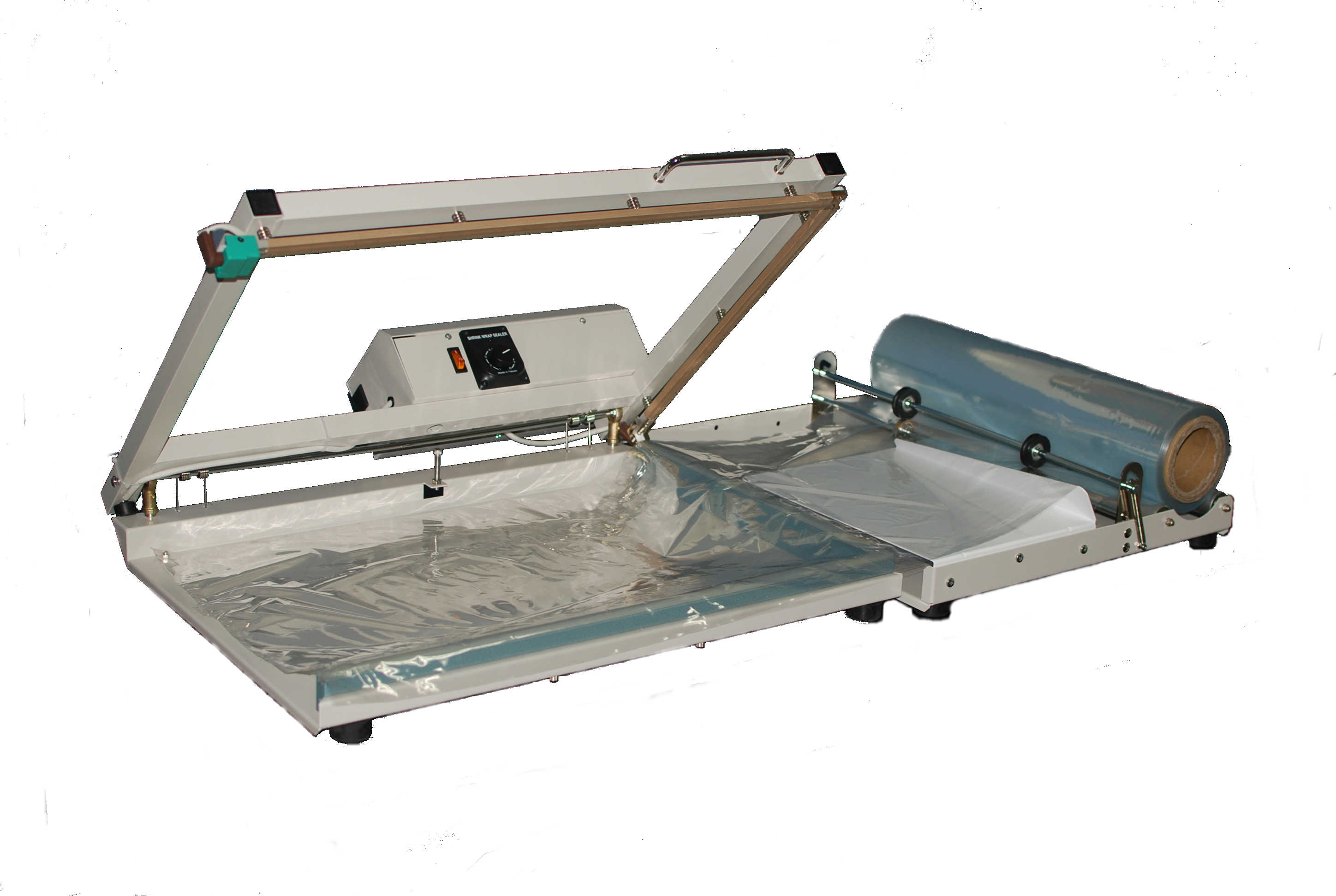 L型收縮包覆P.P., P.V.C., P.E.等材質只要一個步驟,此機可以一次同時封兩條線,節力又省時間,長寬各340㎜的L型把手可以封切最厚0.025㎜的材質,消耗功率550W,封口時間1到4秒。整組包括收縮膜的滾軸架。